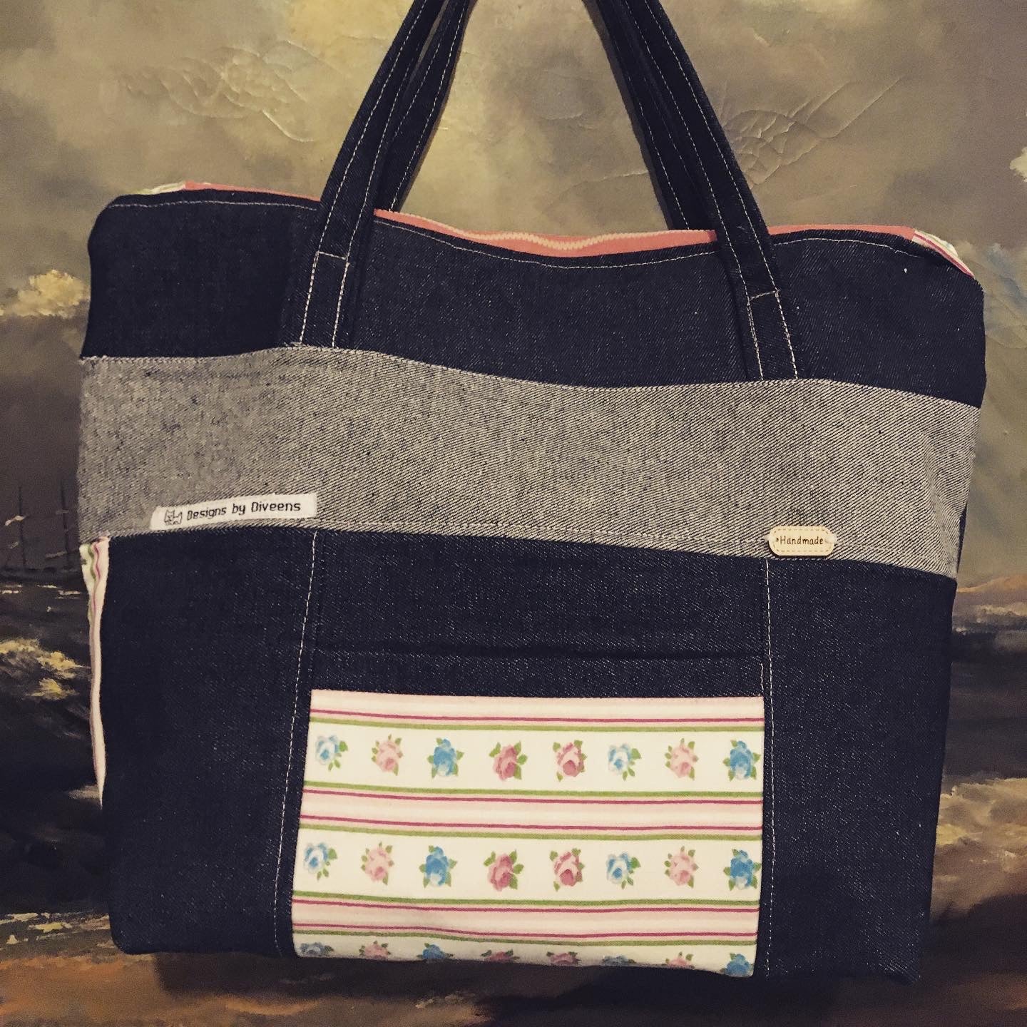 A denim lined shoulder bag with inner and outer pockets